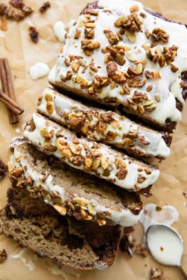 آیسینگ دو ماده ای طعمی شبیه به پنیر خامه ای دارد، اما پروتئین بالاتری نیز تأمین می کند. خانواده ام عاشق این دستور نان موز با لایه گردشی دارچین هستند – هر برش آن مانند یک دسر لذیذ است!