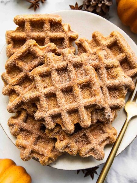 پسران من عاشق این هستند که روی وافلها را با مخلوط شکر و دارچین بپوشانند تا طعم و بافتی شبیه به دونات کدوحلوایی پیدا کند، اما صادقانه بگویم حتی با کمی شربت به تنهایی هم فوقالعاده خوشمزه است! به هر شکلی که سرو کنید، از سادگی و سرعت تهیه این وافلهای پرپروتئین لذت خواهید برد.