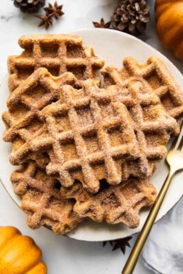 پسران من عاشق این هستند که روی وافلها را با مخلوط شکر و دارچین بپوشانند تا طعم و بافتی شبیه به دونات کدوحلوایی پیدا کند، اما صادقانه بگویم حتی با کمی شربت به تنهایی هم فوقالعاده خوشمزه است! به هر شکلی که سرو کنید، از سادگی و سرعت تهیه این وافلهای پرپروتئین لذت خواهید برد.