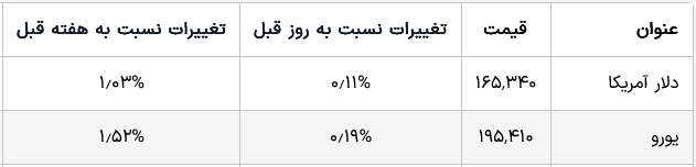 قیمت دلار آمریکا امروز حدود ۱۶۵ هزار و ۳۴۰ تومان است که نسبت به روز قبل ۰.۱۱٪ افزایش داشته و یورو ۱۹۵ هزار و ۴۱۰ تومان است که نسبت به روز قبل ۰.۱۹٪ رشد کرده است. دلار نسبت به هفته گذشته ۱.۰۳٪ و یورو ۱.۵۲٪ افزایش قیمت داشتهاند.