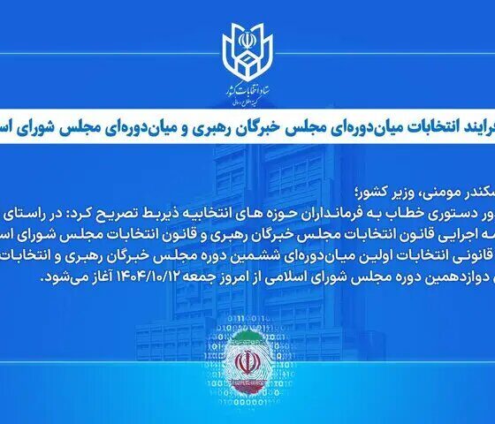 به گزارش خبرگزاری مهر، اسکندر مومنی وزیر کشور، ضمن تبریک میلاد پر برکت حضرت امیرالمؤمنین علی (ع)، روز مرد و گرامیداشت مقام پدر، با صدور دو دستور جداگانه خطاب به فرمانداران حوزه‌های انتخابیه ذیربط، آغاز فرآیند قانونی انتخابات اولین میان‌دوره‌ای ششمین دوره مجلس خبرگان رهبری و انتخابات میان‌دوره‌ای دوازدهمین دوره مجلس شورای اسلامی را بر اساس اجرای «مواد ۲۸ و ۷۹» آئین‌نامه اجرایی قانون انتخابات مجلس خبرگان رهبری و نیز «مواد ۳۴ و ۵۴» قانون انتخابات مجلس شورای اسلامی و لحاظ «تبصره ۱ ماده ۴» این قانون، از امروز جمعه ۱۴۰۴/۱۰/۱۲ اعلام کرد.