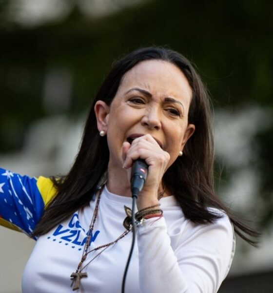 ماریا کورینا ماچادو با کت مشکی، در حالی که دست راست خود را بالا برده، روی یک بالکن ایستاده است.
