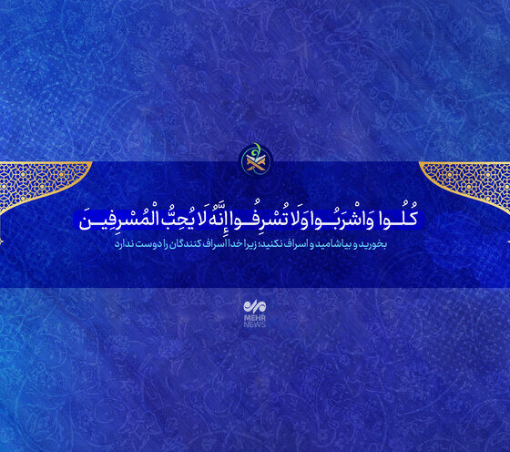 وَکُلُوا وَاشْرَبُوا وَلَا تُسْرِفُوا إِنَّهُ لَا یُحِبُّ الْمُسْرِفِینَ؛اعراف، آیۀ ۳۱